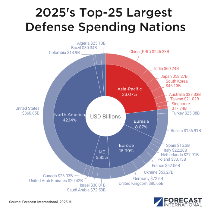 The Asia-Pacific region is home to one of the world’s most dynamic defense markets and a driving factor in the global arms trade. According to Forecast International figures, of the top twenty-five largest defense spending countries in the world, seven reside in the Asia-Pacific, including the second-largest global military spender in China.